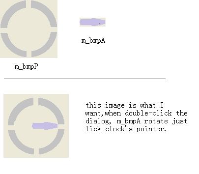 有两张位图CBitmap m_bmpP,m_bmpA; 欲将它们绘制到区域CRect m_rtCtrl;上,绘制目标:将m_bmpP绘制为背景,m_bmpA绘制在m_bmpP的中心,当有按键事件改变m_fAngle的值时,让m_bmpA在m_bmpP的中心旋转m_fAngle角度。请问如何实现?我的实现方法如下,但是按键后(旋转值m_fAngle不为0)两张位图都消失了,当m_fAngle为0时能正常显示,应该是旋转位图时操作不正确,但是我找不出原因,麻烦各位了。 位图如下: