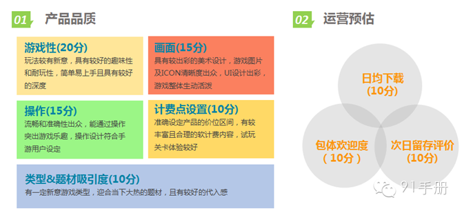 游戏推广评估:名称;icon的吸引力;包体大小 游戏性:音乐、美术风格;操作感;新手引导 计费设置:计费UI设计;计费点和计费体验设计