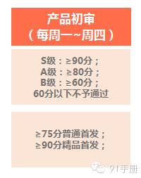 S级产品(90分以上)、A级产品(85分-89分)B级产品(80分-84分)C级产品(70分-79分)D级产品(69分以下)。B级以上产品进入灰度试量环节,根据数据指标获得产品最终评级。