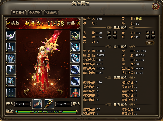 在勇者无敌中行走大荒,对抗妖魔,最重要的是要先了解自己,一起来看看最重要的个人属性吧。 按“C”键可以显示人物信息窗口,如下图: 角色属性界面 基本属性 力量:力量影响人物的物理攻击 智力:智力影响人物的法术攻击 敏捷:敏捷影响人物的命中、闪避、暴击、韧性 耐力:耐力影响人物的生命和物理防御,法术防御 战斗属性 生命值:人物生命的实时数值 法力值:人物魔法的实时数值 物理攻击:在物理和平衡类伤害的技能中影响普通伤害 物理防御:在被物理和平衡类伤害的技能攻击时减免普通伤害 魔法攻击:在法术和平衡类伤害的技能中影响普通伤害 魔法防御:在被法术和平衡类伤害的技能攻击时减免普通伤害 命中率:决定角色的命中机会 闪避率:减少人物被技能伤害时的命中机会 暴击率:人物发生暴击伤害的机率 韧性:减少被攻击时暴击的发生频率 生命上限:决定人物生命的最大值 法力上限:决定人物魔法的最大值 元素属性 破甲伤害:按目标护甲值降低后所产生的伤害 贯穿伤害:贯穿所产生的伤害 毒素伤害:毒素所产生的伤害 符咒伤害:符咒所产生的伤害 音波伤害:音波所产生的伤害 破甲抗性:减免破甲产生的伤害 贯穿抗性:减免贯穿产生的伤害 毒素抗性:减免毒素产生的伤害 符咒抗性:减免符咒产生的伤害 音波抗性:减免音波产生的伤害 其他属性 暴击伤害:暴击后所产生的伤害值 移动速度:决定角色的移动速度 背袭伤害:在目标背后所产生的攻击伤害 背袭抗性:减免对背后攻击伤害 更多攻略登录勇者无敌官网:http://yz.177yx.com 勇者无敌官方QQ群:499164968