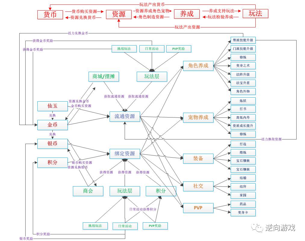 对于逆向玩转游戏,作为设计者,更多考虑的是如何从游戏表象拆解到游戏本质,即游戏各个系统。逆向游戏里,不聊废话,直接上干货。 1.经济系统 梦幻手游经济系统流通图