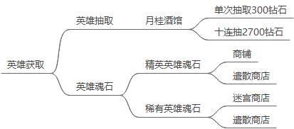 英雄魂石兑换 另一种主要的英雄卡牌产出方式是由魂石兑换,60个相同品质的魂石可以随机产出一个该品质的英雄。我把英雄碎片也看作是魂石,因为同样需要合成,但是随机产出变成了指名产出。魂石品级分为稀有(蓝色)和精英(紫色)。在各种副本,如王座之塔,异界迷宫,和时光之颠中都会大量产出,而各个副本单独的商店也会通过独有货币的形式让玩家去兑换魂石。 作为除了十连抽外最重要的英雄产出方式,魂石的设计让策划可以很明确的控制不同品质的英雄的产出量和产出所需要花费的时间。同样的,这与《小冰冰传奇》中精英副本“伪随机“产出英雄碎片的设计如出一辙。我给伪随机打上引号是因为《小冰冰传奇》中的伪随机实在是太过固定,基本所有玩家都可以清晰的算出该英雄通过精英副本产出的时间。我认为这是一个很大胆的设计,并且在这之后,也有数不清的游戏学习了这样的产出方式。玩家可以很轻松的通过这种方式形成一套游戏内的价值观,十连抽=多少钻石=多少RMB=多少个X品质英雄,而通过副本 X个X品质的英雄= 多少现实中的时间(通过多少关卡)。不同的玩家会自行去判断是否”值得“付费来加速这个过程。