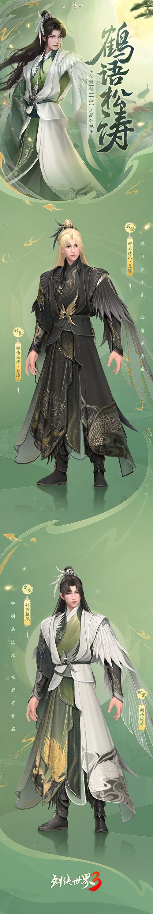当仙鹤遇上松柏,谱写江湖诗意!全新主题时装【鹤语松涛】清雅而来,《剑侠世界3》研发团队取“松柏长青”、“仙鹤千年”的长寿美好之意,结合剑侠经典美学,将仙鹤高贵清冷之美、松柏欺霜傲雪之气化作衣裳,创作出独具古韵的鹤松主题时装,助力畅游至美江湖!