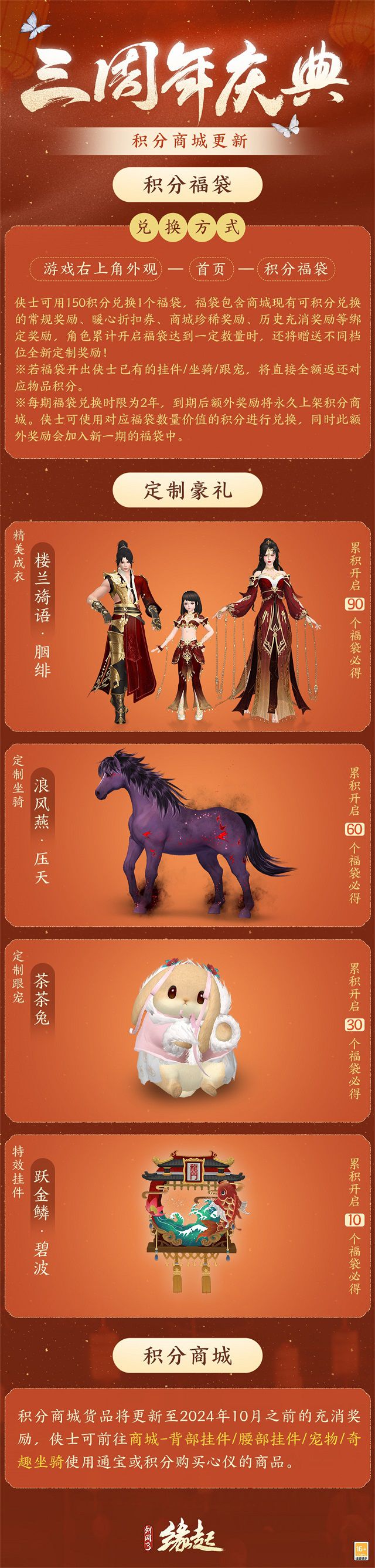 三周年庆典火热来袭,游戏内积分商城全面焕新。本次更新推出积分福袋,150积分即可兑换,内含丰富奖励!同时,多款定制豪礼惊艳亮相,包括精美成衣、炫酷坐骑、可爱跟宠及特效挂件等。此外,积分商城货品同步更新至2024年10月前充消奖励,侠士可使用通宝或积分自由选购!