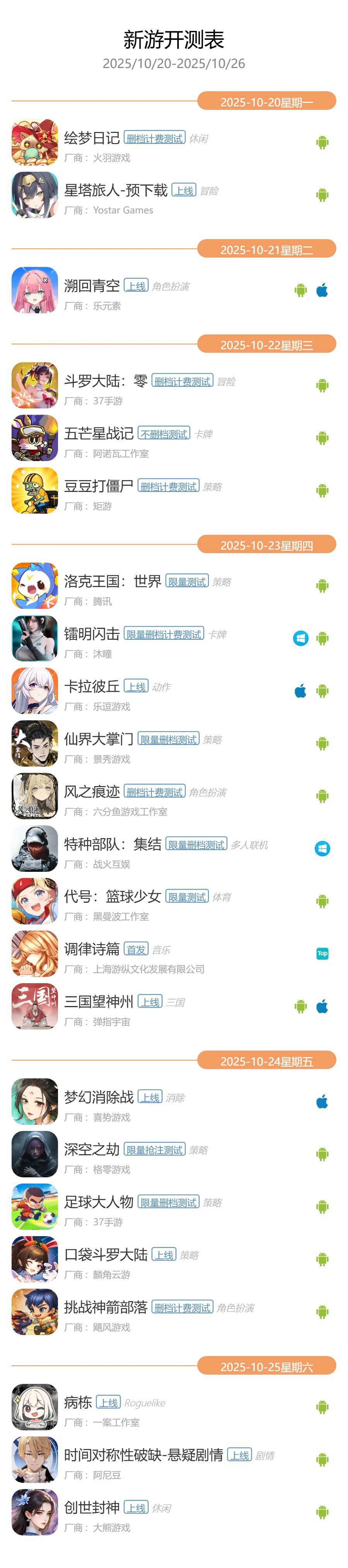 GameRes游资网统计了2025年10月20日—2025年10月26日的最新手游开测信息,共有23款游戏开测。以下是开测信息: