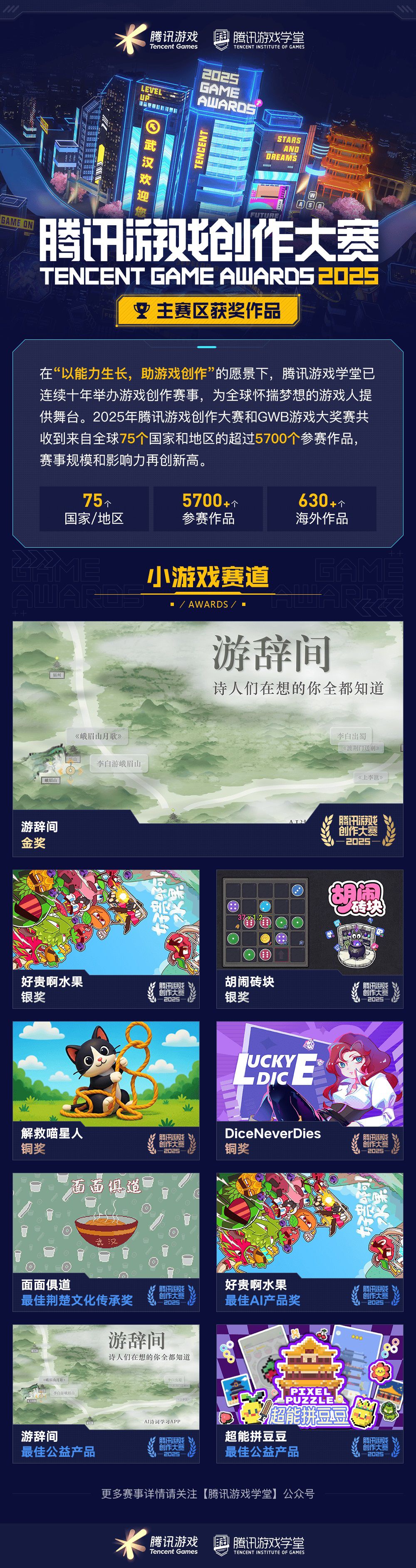 11月9日,“2025腾讯游戏创作大赛”闭幕暨颁奖仪式在武汉顺利举行。本届赛事活动共收到全球75个国家和地区共计5744份参赛作品,活动现场,主赛区、《元梦之星》赛区、《王者荣耀》美术设计赛区三大赛区,以及GWB游戏大奖赛的获奖名单正式揭晓。