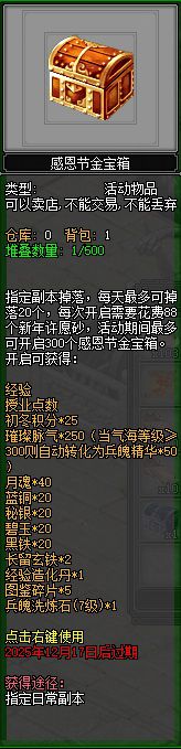 大侠通关副本、幻境等玩法会额外掉落感恩节银宝箱/金宝箱,每种宝箱每日最多获得20个,开启可得对应好礼。