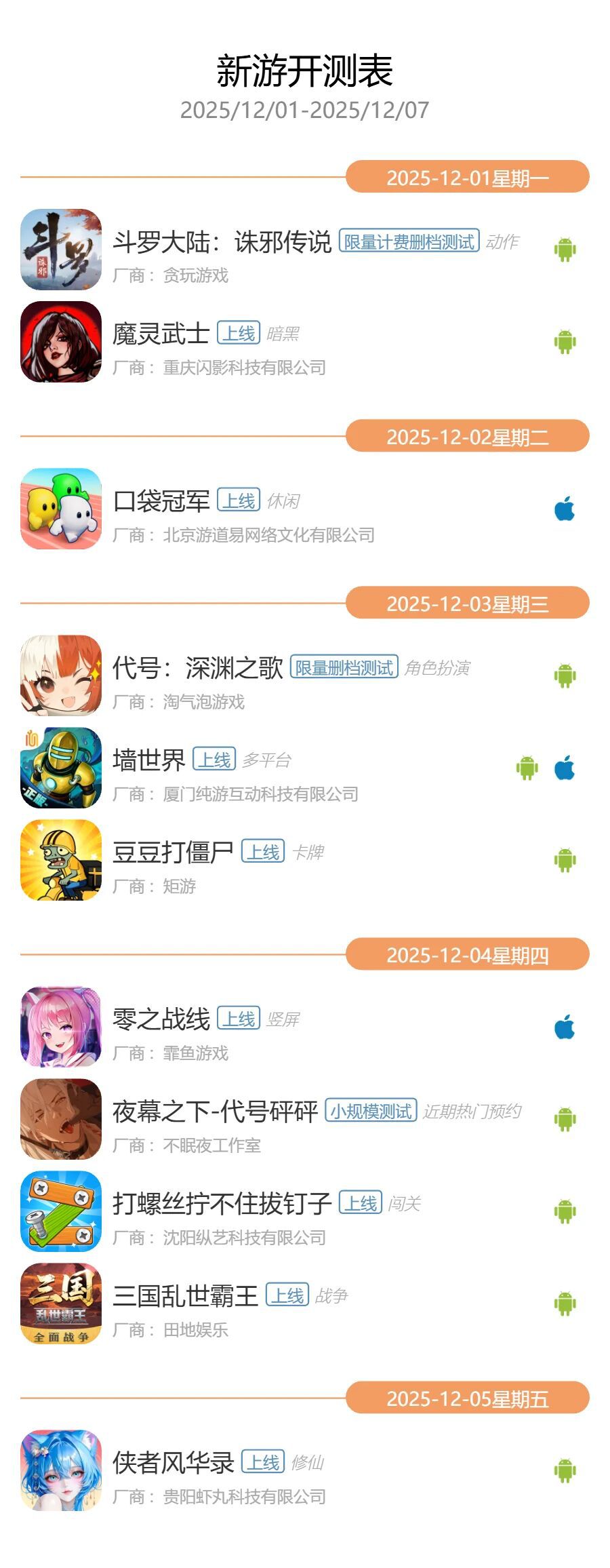 GameRes游资网统计了2025年12月1日—2025年12月7日的最新手游开测信息,共有11款游戏开测。以下是开测信息: