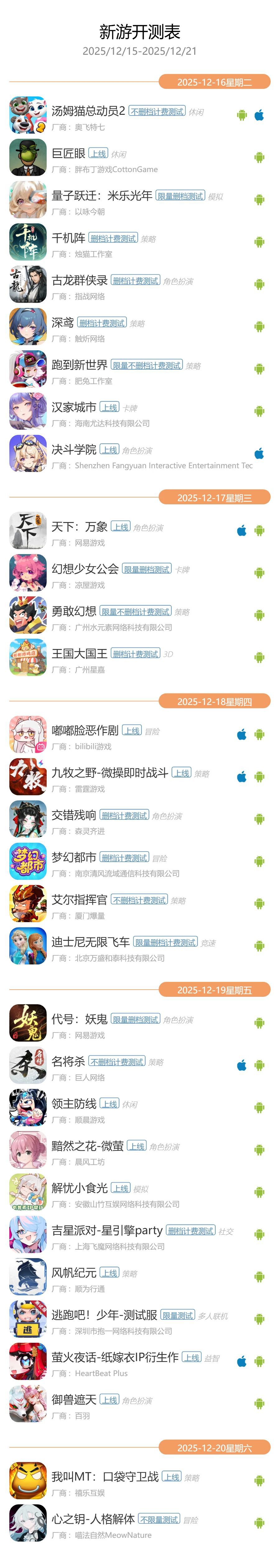 GameRes游资网统计了2025年12月15日—2025年12月21日的最新手游开测信息,共有31款游戏开测。以下是开测信息: