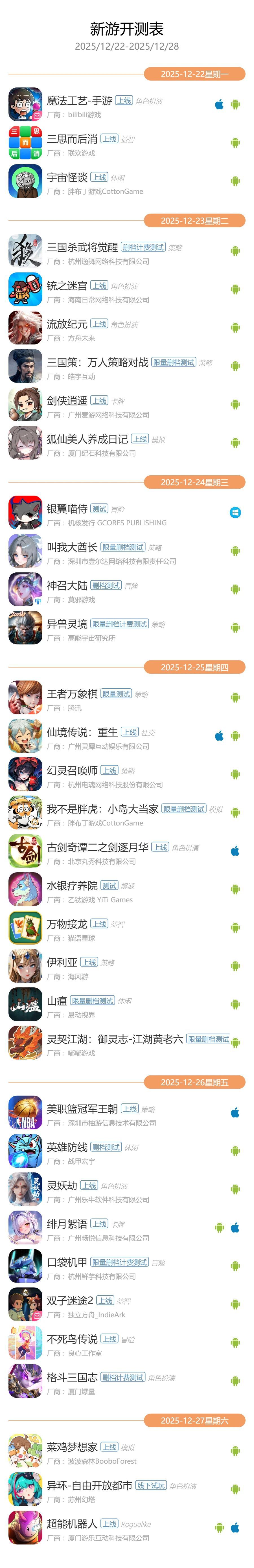 GameRes游资网统计了2025年12月22日—2025年12月28日的最新手游开测信息,共有34款游戏开测。以下是开测信息: