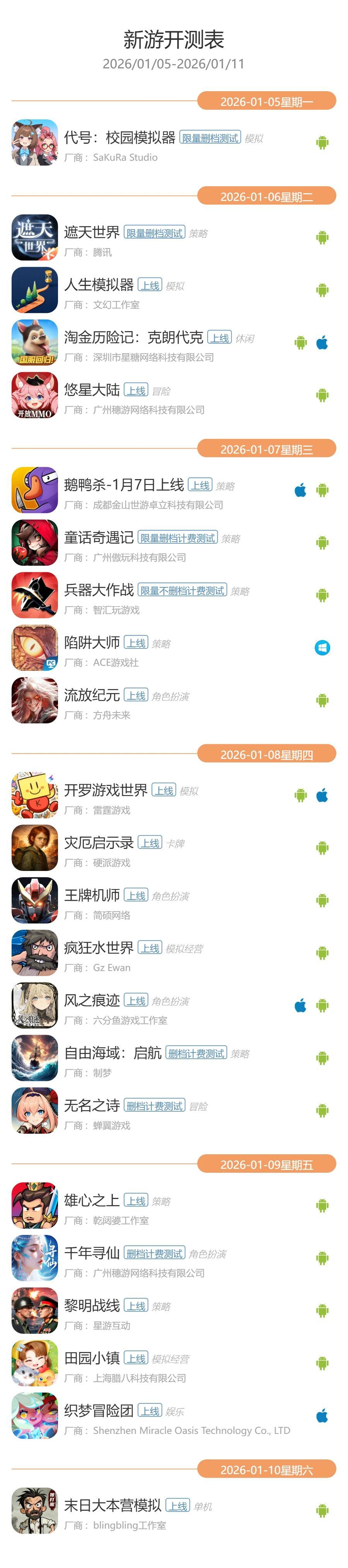 GameRes游资网统计了2026年1月5日—2026年1月11日的最新手游开测信息,共有28款游戏开测。以下是开测信息: