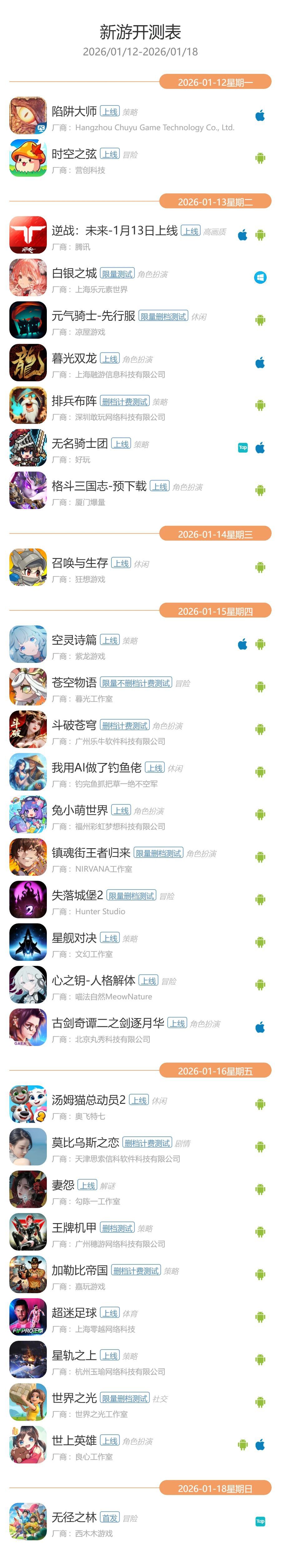 GameRes游资网统计了2026年1月12日—2026年1月18日的最新手游开测信息,共有30款游戏开测。以下是开测信息: