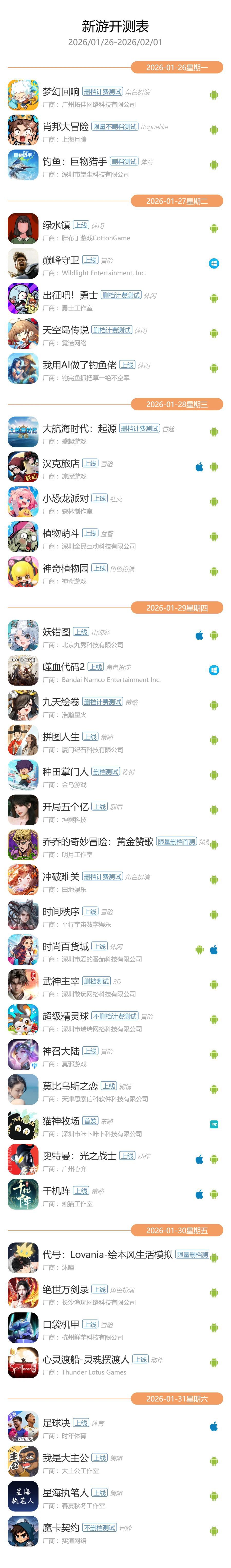 GameRes游资网统计了2026年1月26日—2026年2月1日的最新手游开测信息,共有38款游戏开测。以下是开测信息: