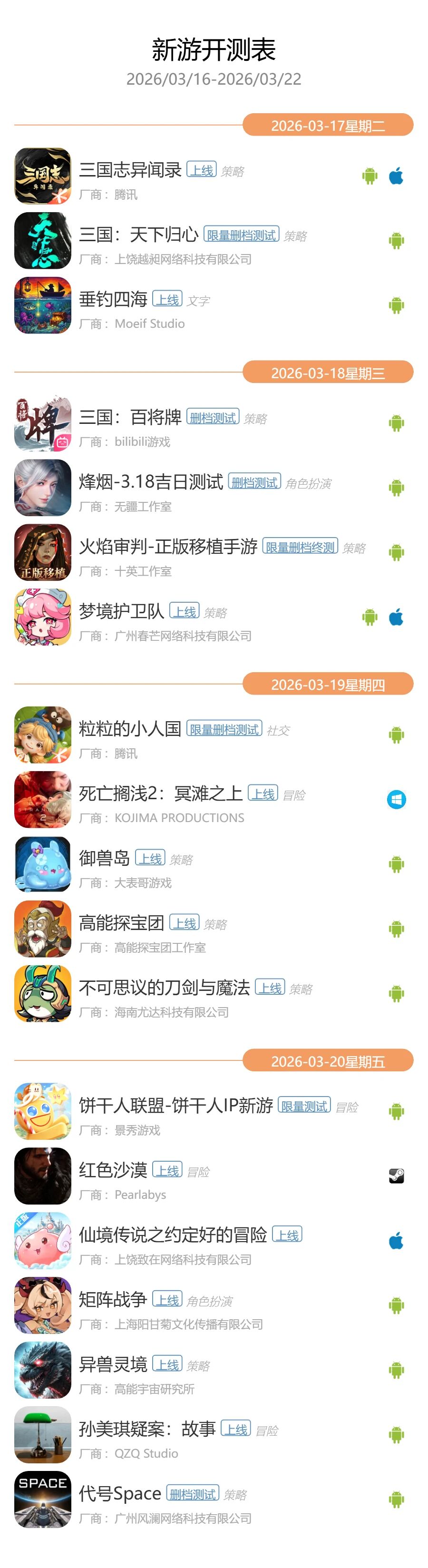 GameRes游资网统计了2026年3月16日—2026年3月22日的最新手游开测信息,共有19款游戏开测。以下是开测信息: